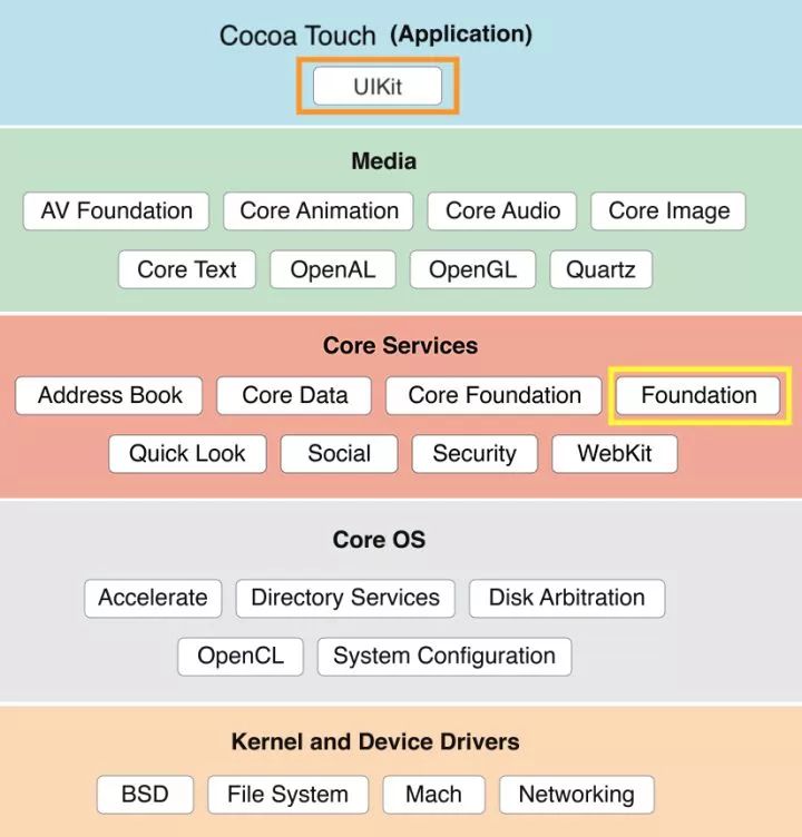 Cocoa 其中最重要和 UIKit(OSX 为 AppKit) 和 Foundation,两个框架在系统中的位置如下图, 同时可以看到常见的框架所在位置。