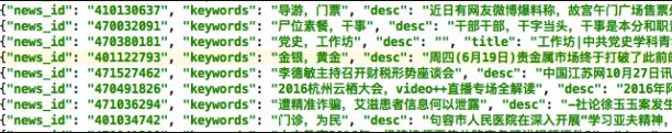 {'news_id': <news_id>,'title':<title>,'content':<content>,'source': <source>,'time':<time>,'keywords': <keywords>,'desc': <desc>, 'desc': <desc>}