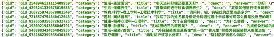 {"qid":<qid>,"category":<category>,"title":<title>,"desc":<desc>,"answer":<answer>}