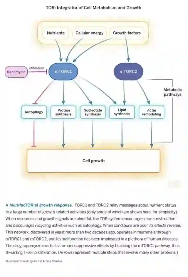 TOR及mTOR发现仅是科学发现的第一步,后续研究表明细胞生长是一个极复杂和精细的调控过程,更多科学家为此做出重大贡献,包括发现mTOR复合物的大卫·萨巴蒂尼教授(David M. Sabatini)、发现mTOR细胞内负调控机制的管坤良教授等,从而推动TOR研究成为当前生命科学和医学的前沿和热门领域。mTOR活性还与长寿相关,其功能异常可引起糖尿病和癌症等发生,也说明了这一领域应用的潜力无限。