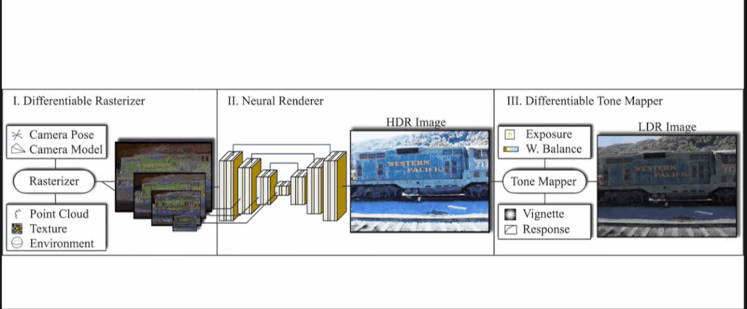 然后通过一个基于物理的可微色调映射器将其转换为给定新视点场景的 LDR图像。