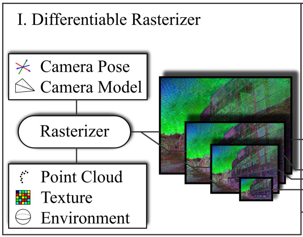 如上图所示,由纹理点云和环境图组成的场景被光栅化为一组具有多种分辨率的稀疏神经图像。