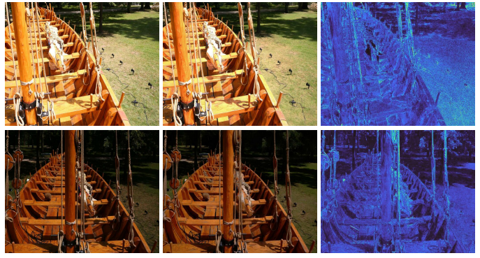 图11:在罗马船只数据集上合成的新视图。使用与参考照片相同的曝光值对图像进行渲染。在右列中,每个像素的误差都是可视化的