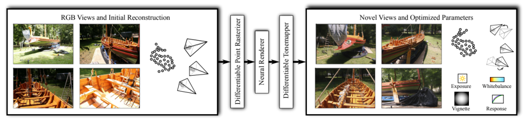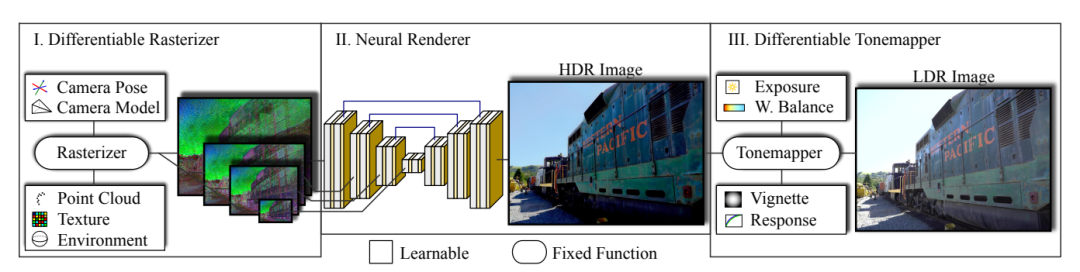 在整个管道中,他们特别添加了一个物理的、可微分的相机模型和一个可微分的色调映射器,并提出了一个公式,以更好地近似单像素点光栅化的空间梯度。
