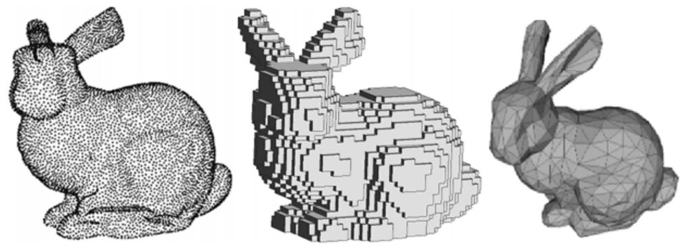 从左到右,分别是点云、体素、三角网格形式的兔子3D图像。
