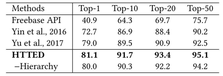 文章使用单关系问答数据集 SimpleQuestions 和知识图谱 FB2M,并有 112 个具有层次父子关系的实体类型。HTTED 的词向量为经过预训练的,关系向量是初始随机的,而类型向量中,叶子类型初始随机,父类型的向量由子类型的向量累加得到。如下图2所示,为 HTTED 与其他系统的效果对比,其中 -Hierarchy表示 HTTED 去除了实体类型的层次结构表示。