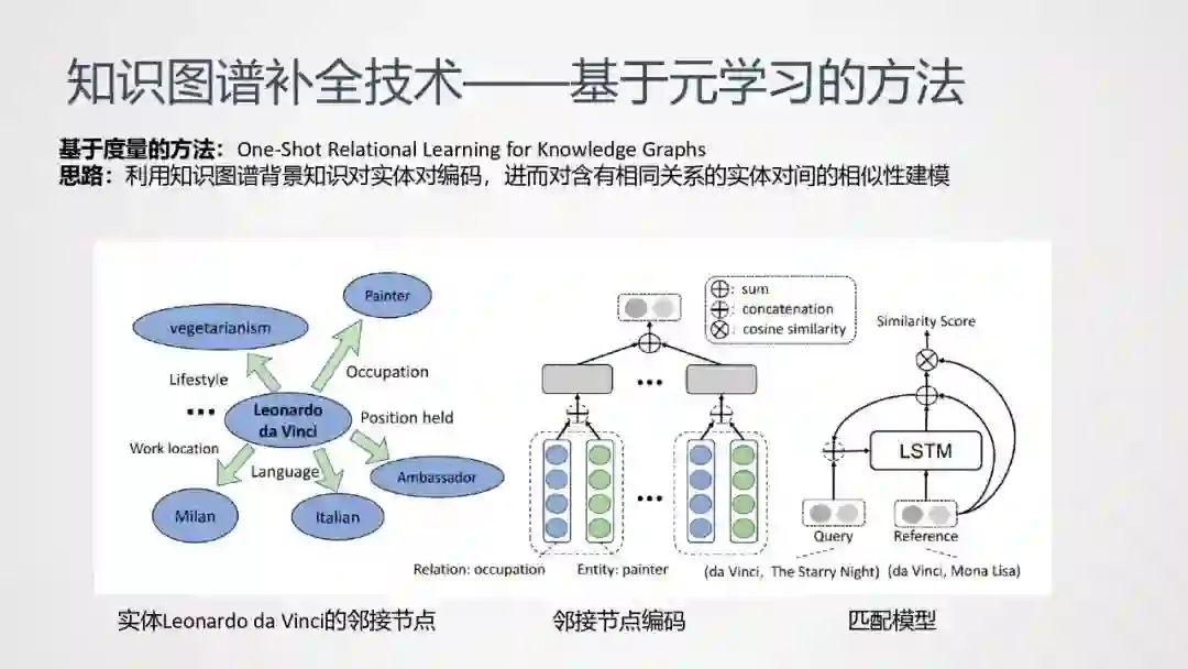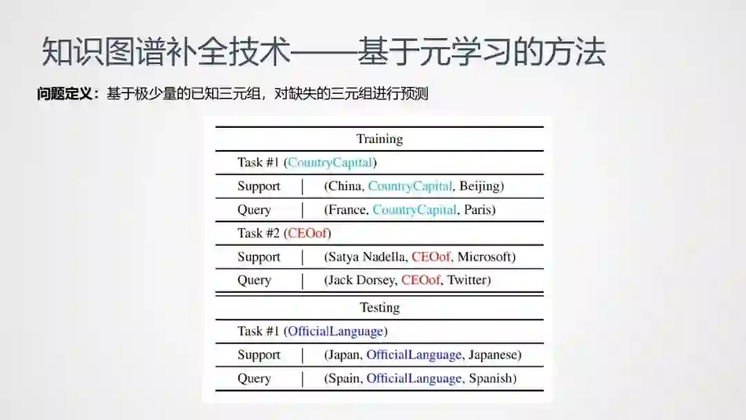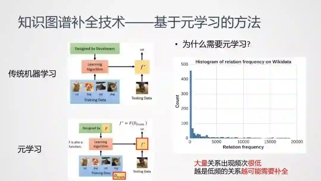 前面介绍的几种方法,往往都需要大量的训练数据;而在知识图谱中,大量关系出现频次很低(即长尾数据);而越是低频的关系,越可能需要补全。为了解决这样的矛盾,有人提出了使用元学习方法。