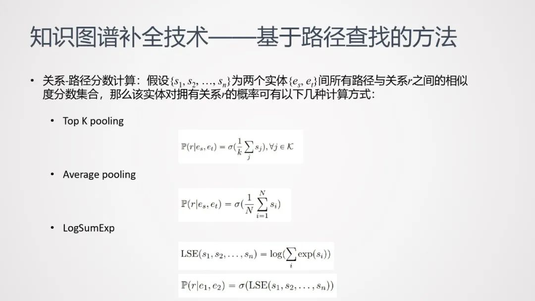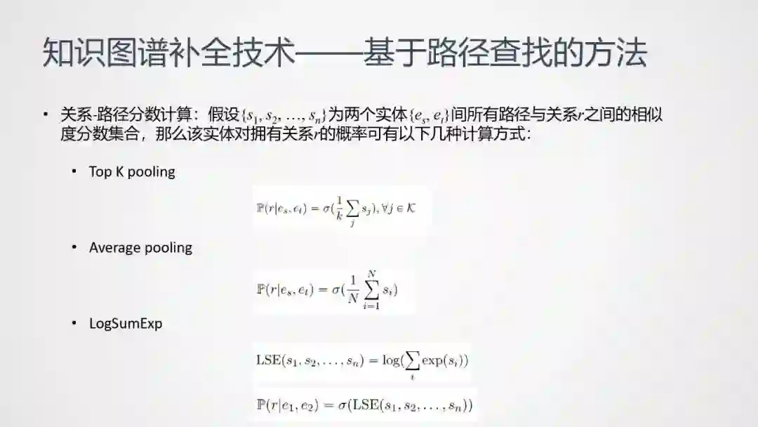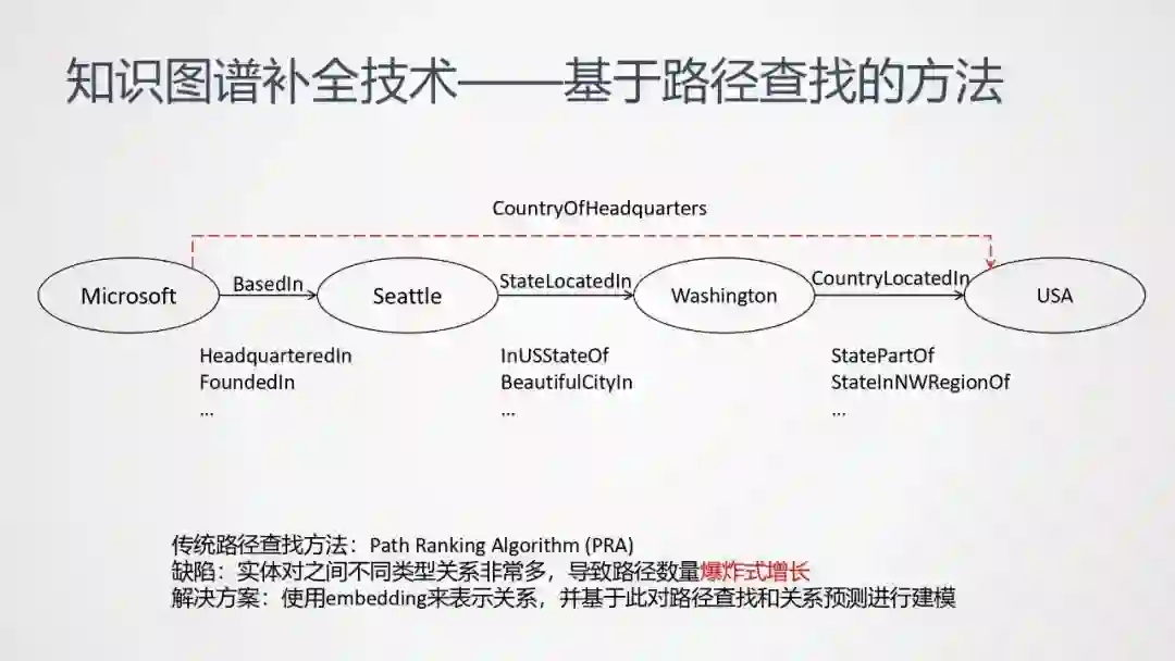 解决的方式,可以尝试用embedding的方式表示关系,对关系进行泛化,并基于此对知识的补全进行建模,以缓解路径数量过多导致的特征空间膨胀问题。