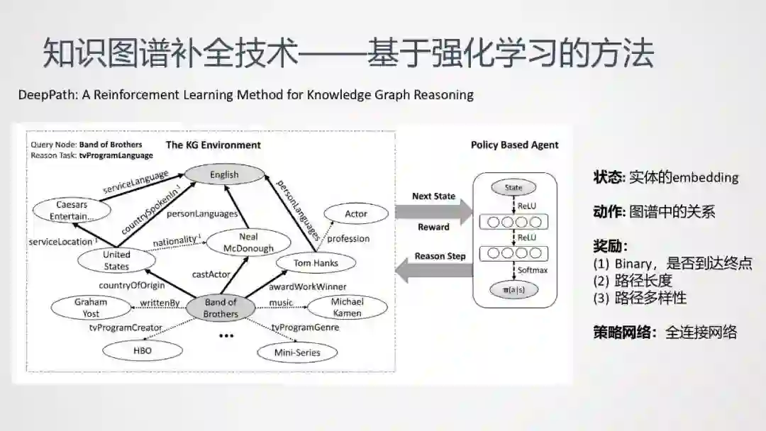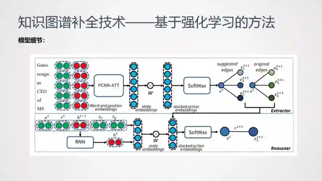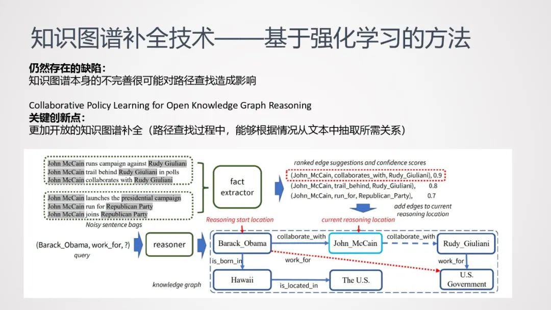 上图中,任务是查找Barack_Obama为哪个组织工作。在原图谱中,John_McCain和Rudy_Giuliani之间的路径是断的;通过弱监督的方式,从原文本中训练出一个关系抽取器,通过这个关系抽取器将缺失的关键路径补充完整。至于是否有必要做路径补充,以及哪一条路径需要补充,则是强化学习中策略选择的工作。