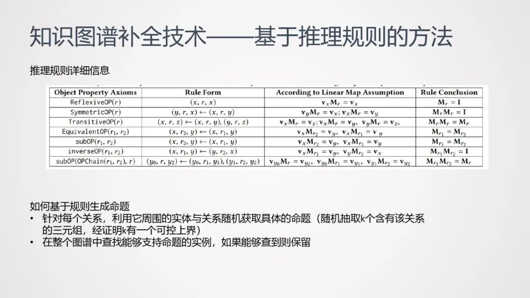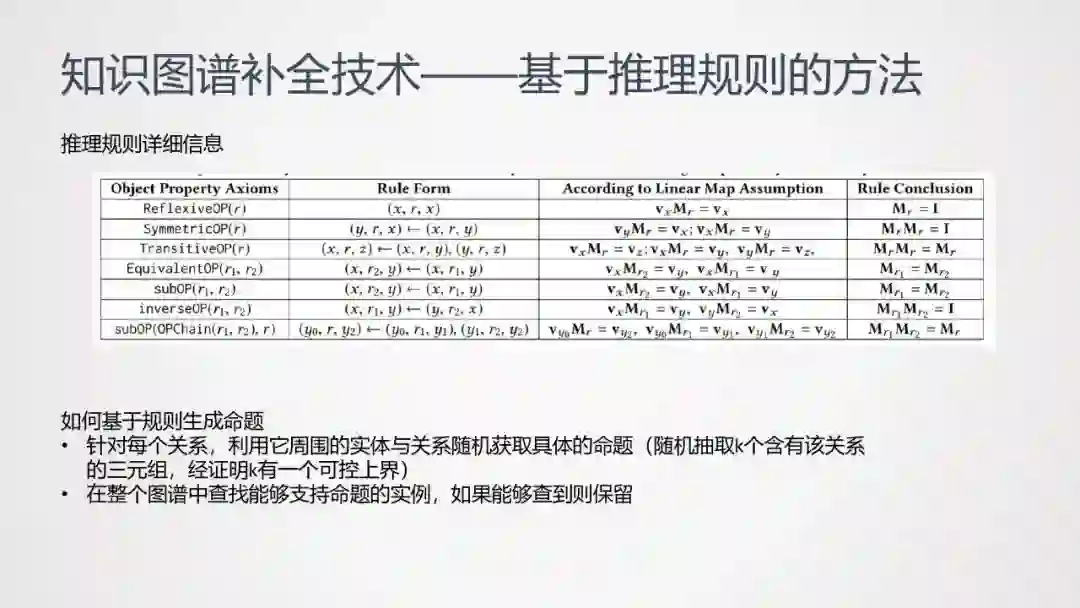 这种方法的input是个Knowledge Graph,通过该Graph训练出一个embedding;选取一些已有规则(如自反规则、传递规则、逆转规则等7种规则,如下表所示),对知识图谱中的已有规则进行扩展,进而生成命题:
