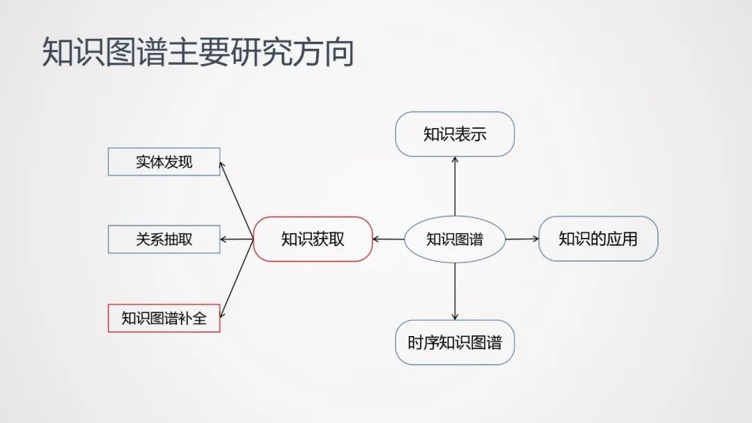 知识图谱的主要研究方向包括知识获取、知识表示、时序知识图谱、知识应用等方向。本次分享,主要聚焦于知识获取中的一个子任务——知识图谱补全。