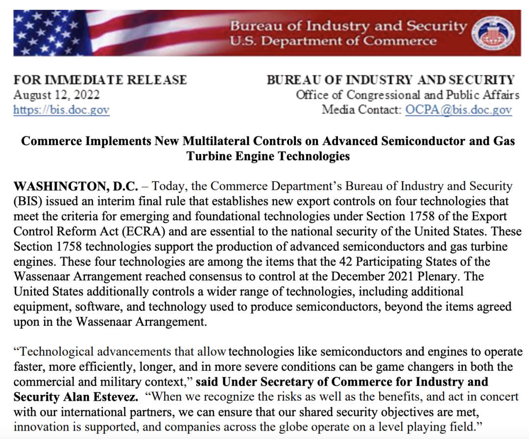 8 月 12 日,美国商务部工业和安全局(BIS)在联邦公报上发布了一项临时最终规定,将 4 项“新兴和基础技术”加入出口管制清单,其中 3 项涉及半导体,并包括芯片设计中最上游、最高端的产业 EDA。