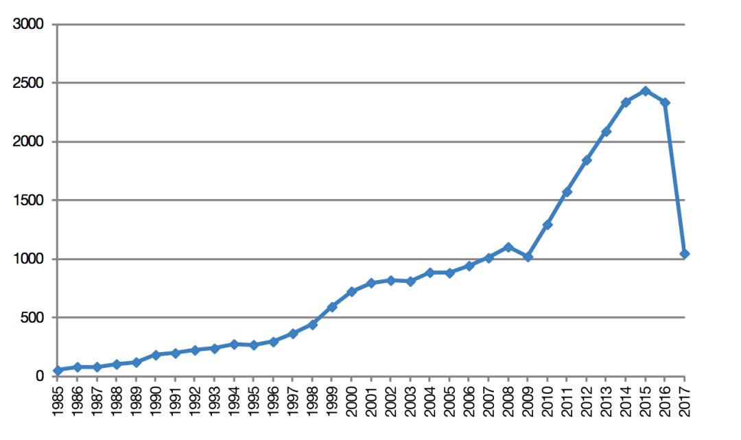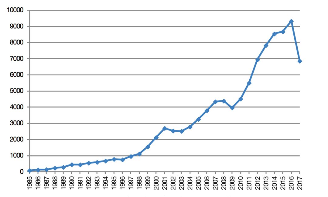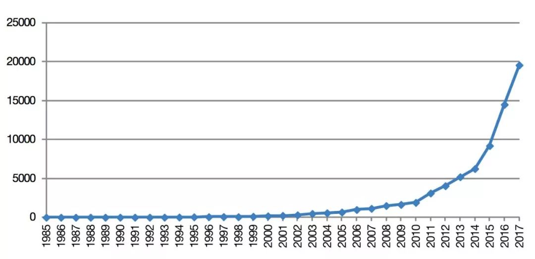 与此同时,美国、日本和欧洲地区的申请量虽然整体处于上升态势,但在2016年前后,申请量有所回落。这三个国家和地区近两年的增长速度稍微放缓,2017年的申请量下降可能是由于部分2017年的专利申请未公开的情况造成。但对于欧洲地区和日本,2017年的申请量整体下降的趋势似乎已经难以逆转。
