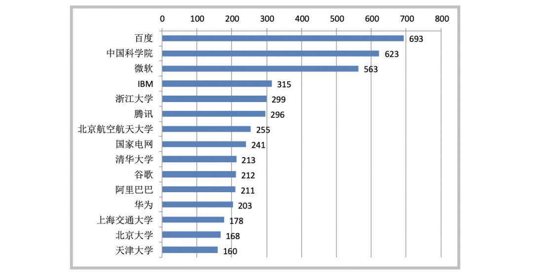 在机器学习和基础算法方向,国内的申请人主要集中在科研院所和大学,在排名前15位的申请人中,占到了10位。其余五位中,国外申请人只有微软,百度、腾讯、阿里巴巴和国家电网占据了其余四席。可见在人工智能的基础算法方面,国内的专利申请虽多,但大量成果仍然处于实验室阶段,只有比较有实力的大型企业才在基础算法方面投入较多。在排名靠前的申请人中,前两位的中国科学院和百度的申请量比较令人瞩目,几乎是第三位的两倍之多,分别成为科研机构和企业在这一领域的标杆。