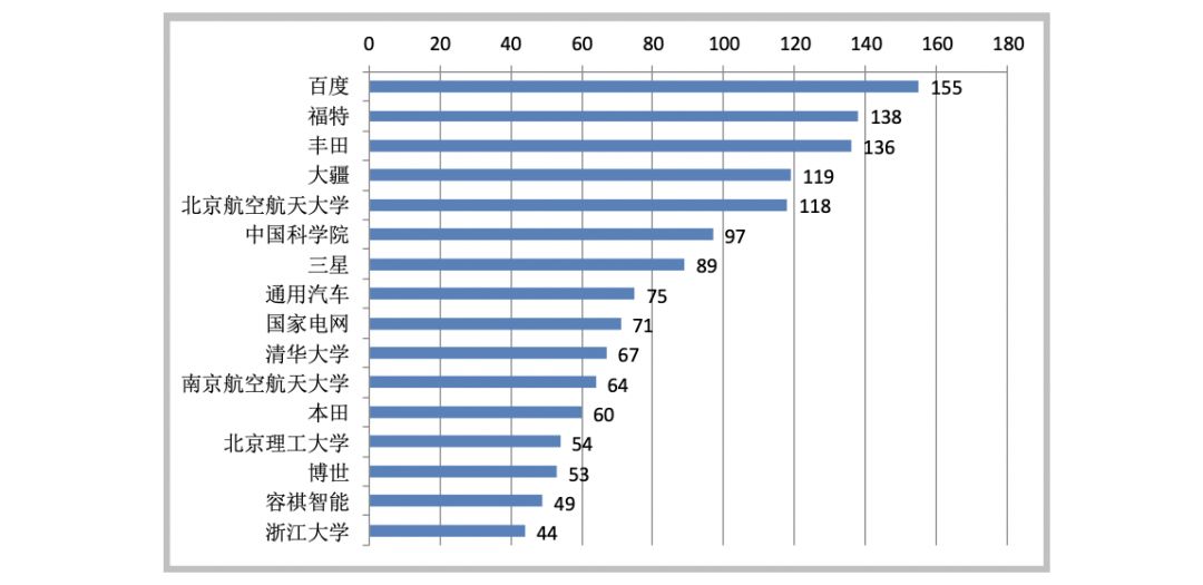 在自动驾驶方向,排名前15的申请人以企业申请人为主,但是这些企业主要是以福特、丰田为代表的国外老牌汽车生产厂商。国内的企业仅有百度、大疆和容祺智能挤进榜单,百度作为上榜的唯一一家互联网公司,申请量列于首位,这应该归功于百度近年来投入研发的无人驾驶项目。而大疆和容祺智能都是生产无人机的厂商,在这一领域的专利申请反而走在了国内各大汽车制造商的前面。科研机构申请人中,北京航空航天大学的申请量最高,应该与该学校特殊的专业设置和研究方向有关。