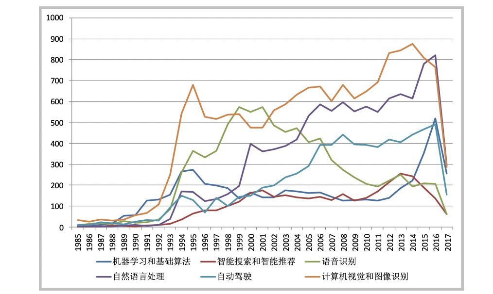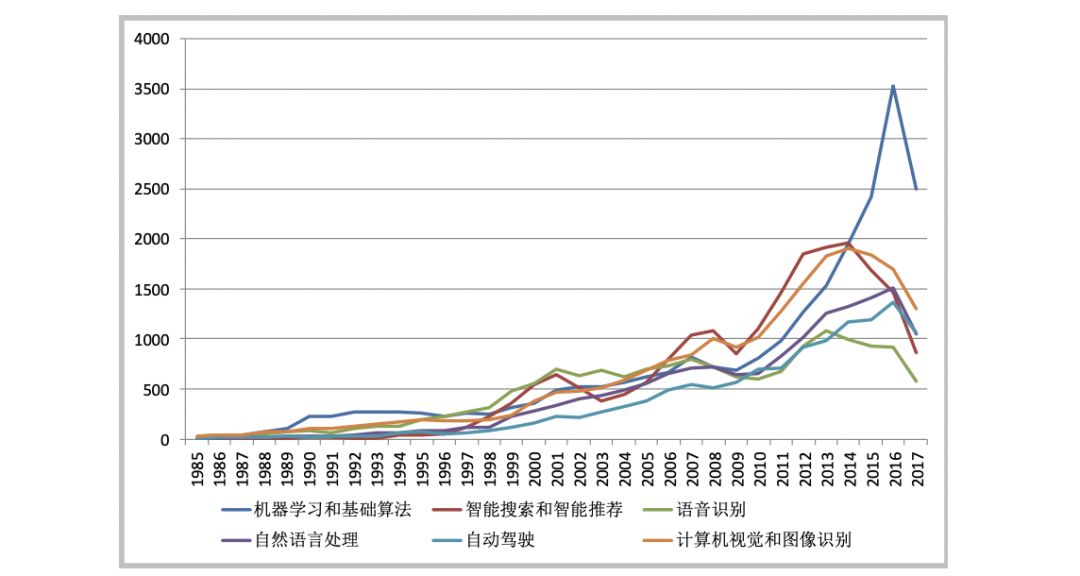 机器学习和基础算法、自然语言处理、计算机视觉和图像识别、语音识别、智能搜索和智能推荐、自动驾驶整体呈上升趋势,其中机器学习和基础算法、计算机视觉和图像识别从20世纪90年代初开始加快发展速度,进入20世纪90年代中期后自然语言处理、智能搜索和智能推荐、自动驾驶也加快了发展速度,达到了一个小高峰,之后曲折式上升,但在2014年以后计算机视觉和图像识别、智能搜索和智能推荐发展速度有所下降,机器学习和基础算法、自然语言处理反而在2014年以后迅速发展,语音识别这一发展路线不同于其他5个发展路线,在进入20世纪90年代中期后迅速发展,在2000年前后达到峰值,但之后一直呈下降趋势,机器学习和基础算法、自然语言处理、自动驾驶在2017年的申请量下降可能是由于部分2017年的申请未公开的原因。
