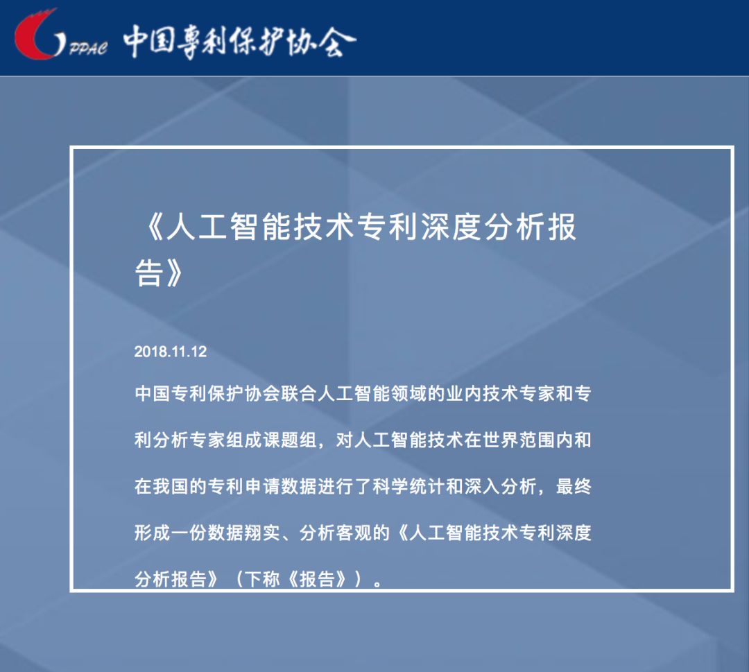 11月12日,中国专利保护协会发布《人工智能技术专利深度分析报告》,对人工智能技术在世界范围内和在我国的专利申请数据进行了科学统计和深入分析。