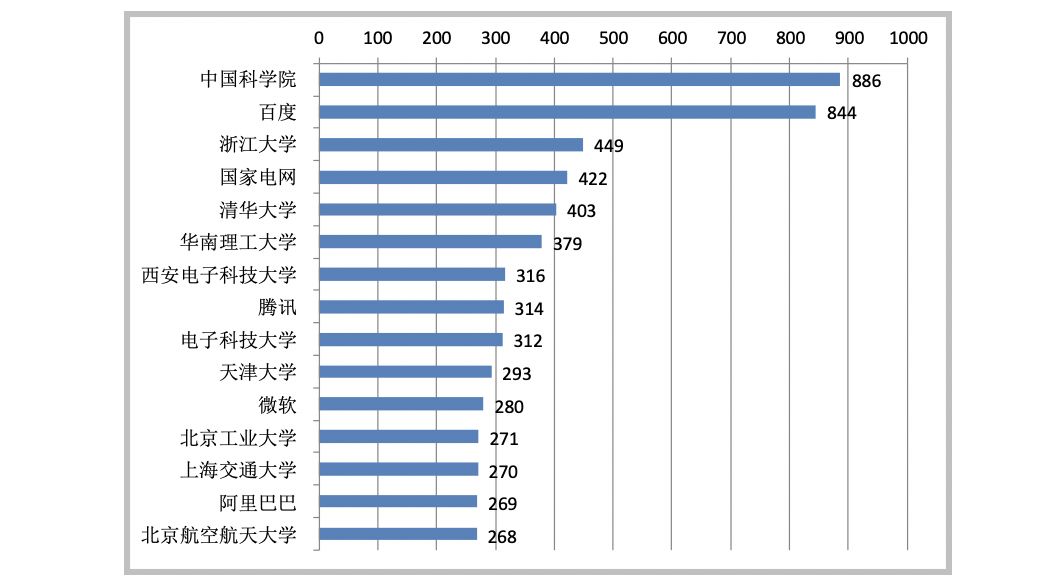 与机器学习和基础算法形成鲜明的对照,在智能搜索和智能推荐方向,专利申请的主力是大型互联网企业及智能终端厂商。国外申请人有四位上榜,分别是微软、三星、谷歌和LG。在国内申请人中,百度的申请量以576件遥遥领先,腾讯以220件位列国内申请人的第二位。在科研机构中,中国科学院和浙江大学排进了前15位,但申请量并不是很大。