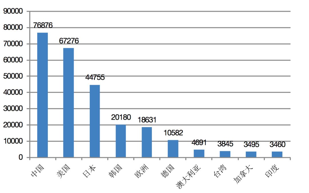 课题组对各个国家/地区的人工智能领域专利申请量进行统计。在DWPI数据库中,排名前十位的国家/地区依次为中国、美国、日本、韩国、欧洲(指在欧专局直接提出申请)、德国、澳大利亚、中国台湾地区、加拿大和印度。其中排名首位的中国专利申请量为76876件,略高于美国的67276件,排名第三的日本有44755件。