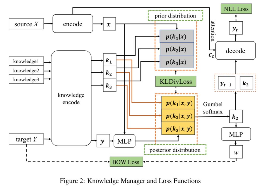 首先,用单独的Encoder模块编码知识和目标输出(训练时),然后通过X,Y计算知识K的先验和后验概率分布,并通过KL散度度量两个概率分布的距离,这里不难理解,先验分布和后验分布相差极小就意味着可以用先验分布采样知识(预测时后验分布未知),并用于生成目标回复Y。第二部分中,通过后验(预测时先验代替)分布采样出与对话相关的知识作为额外的知识特征,与Decoder模块的输入一起编码,再和被encoding的sourceX一起预测下一个词。此外,训练的损失函数包含KL散度,NLL损失和BOW损失,第三部分就是用BOW损失考量被采样出的知识(图中的k2)与目标输出文本相关的概率。