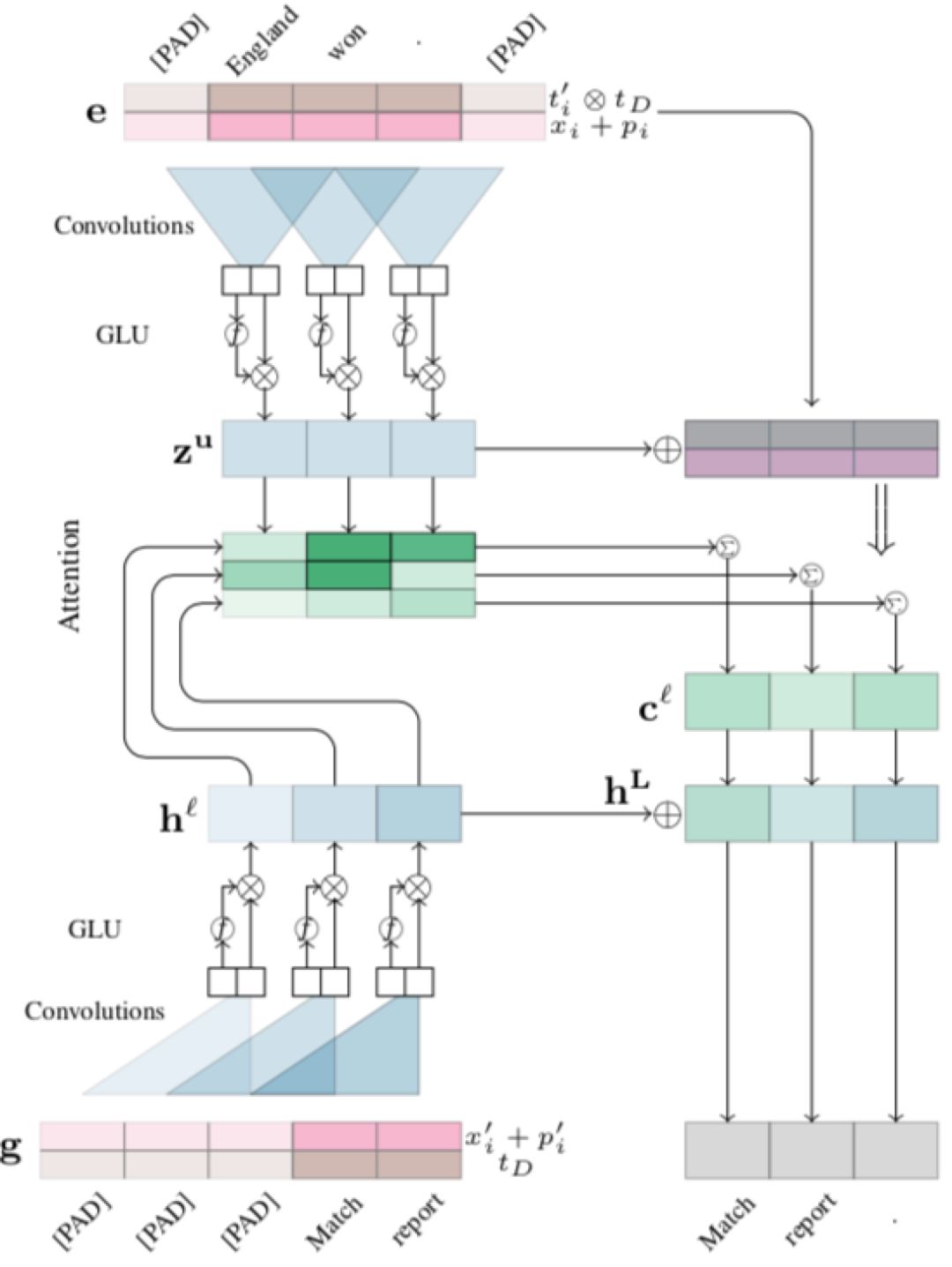 2017年有两篇基于机器翻译任务的工作摆脱了RNN结构,采用了CNN和Transformer,一定程度上证明了非RNN结构在NLP任务上的可行性。Facebook的这篇Convolutional Sequence to Sequence Learning提出了基于Attention-Seq2seq框架的Convs2s结构,用CNN做编解码单元,通过学习位置向量弥补CNN不具备的序列特征捕捉特性,并借助残差结构,GLU等技巧让网络可以堆叠的足够深,从而让CNN也能捕捉长距离文本特征,另外CNN的并行能力远超RNN,因此该结构理论上似乎可以更节省时间,本节将介绍两篇基于Convs2s结构的工作,第一篇融合了主题模型作为额外的特征,第二篇结合了强化学习的方式,两者虽基于Convs2s结构,但对其他结构同样有启发性。