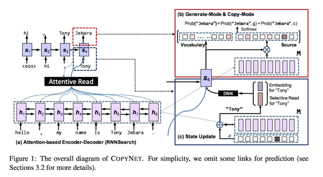 上图展示了copy-net,左边是传统的attention-seq2seq结构,右边包含了copy-net全部改进思路。红框中展示了结合generate-mode和copy-mode的输出词预测,下面的蓝框包含了针对Decoder编码状态值的改进。
