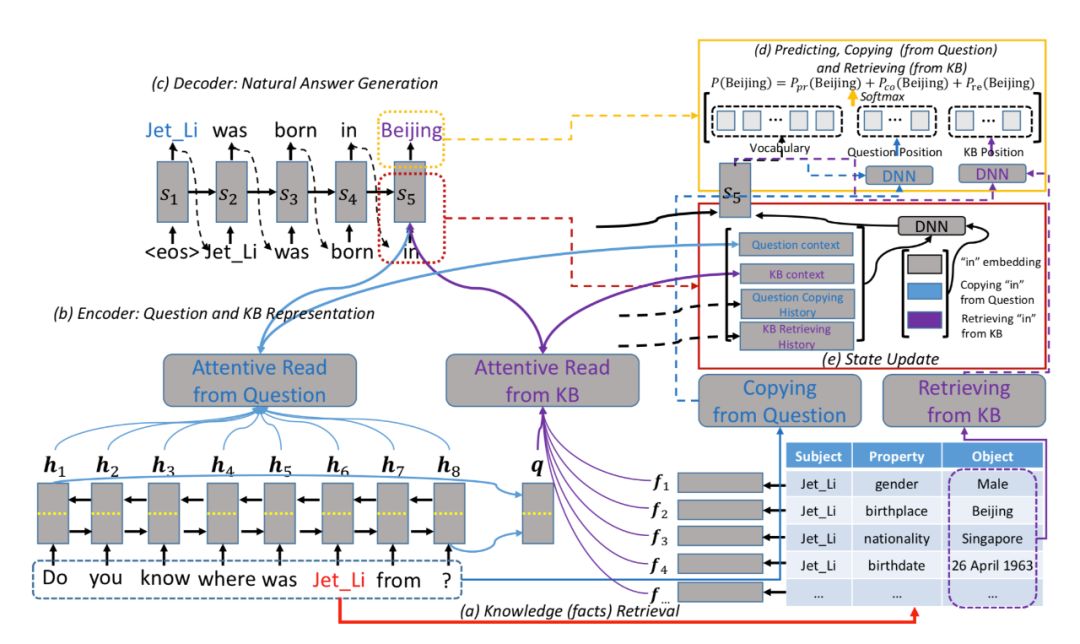 本文来自阿里团队,以问答系统为实验场景,在copynet的基础上加入知识检索模块共同配合回复生成。模型结构图如下: