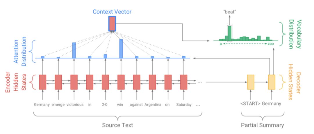 atention-seq2seq如上图所示,红色部分为Encoder模块,用于编码输入文本,计算状态值作为黄色的Decoder模块的初始状态;蓝色部分是Attention机制,结合Encoder模块和Decoder输入计算Context向量;最终Decoder部分结合Encoder的输入状态,Context向量,以及Decoder的历史输入,预测当前输出对应于词典的概率分布。