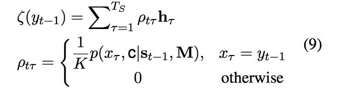 此外,蓝框中包含了复杂的状态更新机制。可以看到,S4的输入不仅包含Tony的词向量,还有一个Selective Read向量,这个是State Update机制计算得到的,这个状态更新机制对encoder后的输入矩阵M进行加权求和,意图是定位M中的某个位置,即输入序列中某个位置的元素,如下图公式所示。