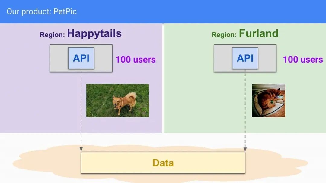 在我们的示例中,PetPic 独立部署在两个不同的区域:Happytails 和 Furland。但是,这些区域的性能表现与为这两个区域提供服务的全局数据库的性能密切相关。正如我们目前所观察到的,Happytails 和 Furland 的客户有着截然不同的兴趣,因此很难调整数据库来高效地为这两个地区提供服务。Furland 客户访问数据库方式的变化可能让 Happytail 用户遇到糟糕的用户体验,反之亦然。