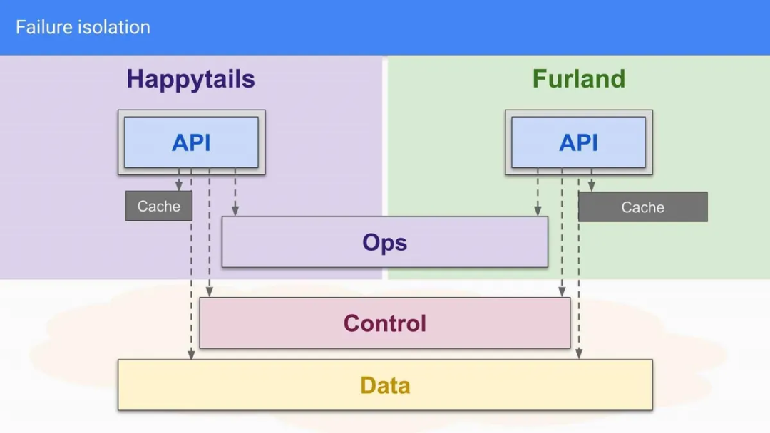产品架构中的其他组件呢?对所有内容都使用缓存是否合理?你能否将在云中运行的服务隔离到特定区域?这两个问题的答案都是肯定的,如果可以,你应该实施这些策略。在云中运行服务并不能避免它成为全局中断的根源。运行在不同云区域的服务仍然可以作为全局服务运行,因此可以成为单点故障来源。将服务隔离到故障域是一种架构决策,并不能仅由运行服务的基础架构来保证。
