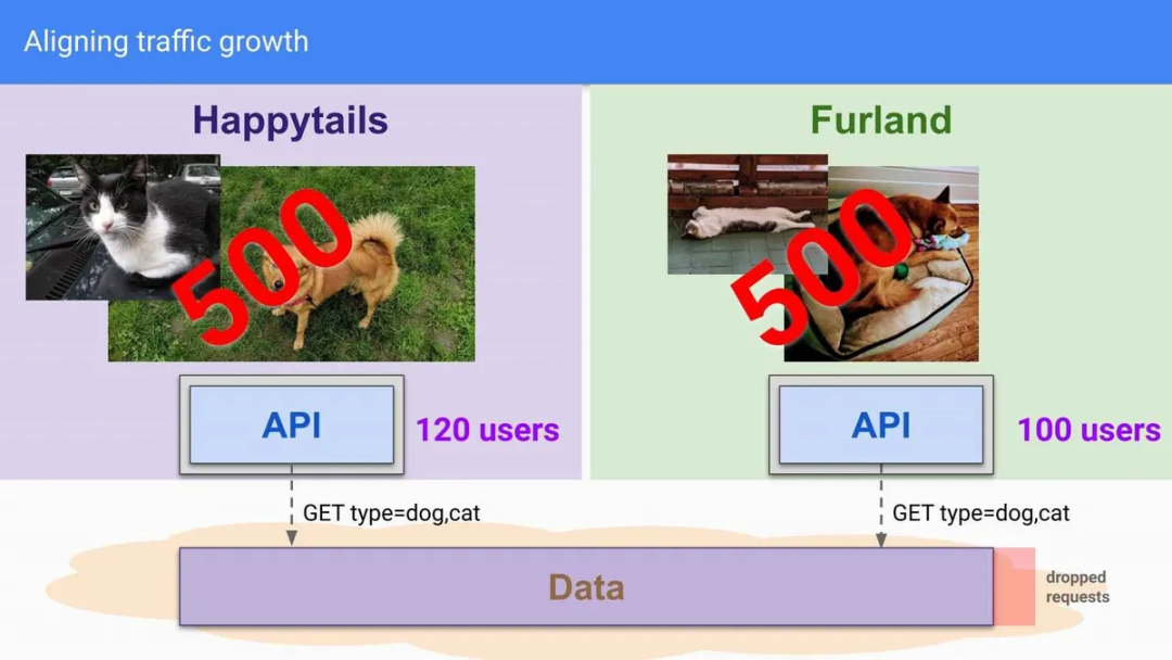 所有信号都表明用户增长 10% 需要数据库资源也增长 10%。为了准备在 Furland 区域推出新特性,PetPic 工程师向数据库中添加了 10% 的额外资源。他们还将 Furland 的 API 资源增加了一倍,以应对新客户的需求。这些更改与在 Happytails 推出新功特性时所做的完全相同。