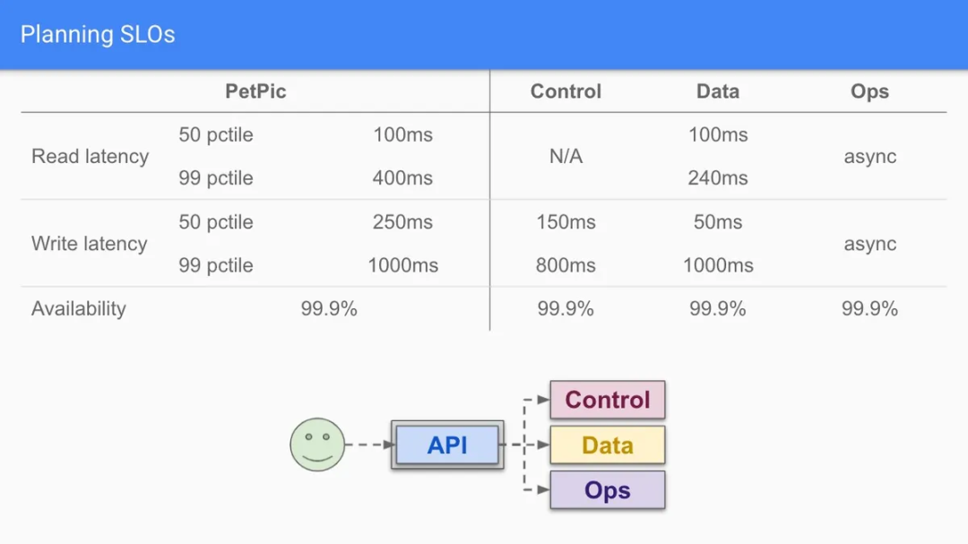 此表显示了工程师眼中将为 PetPic 客户提供出色用户体验的 SLO。在这里,我们还可以看到每个内部组件提供的 SLO。请注意,API SLO 必须基于 API 后端(例如 Control 和 Data)的 SLO 构建。如果需要更好的 API SLO,但我们又无法做到,我们需要考虑更改产品设计并与后端所有者合作以提供更高的性能和可用性。考虑到我们最新的 PetPic 架构,让我们看看 API 的 SLO 是否有意义。