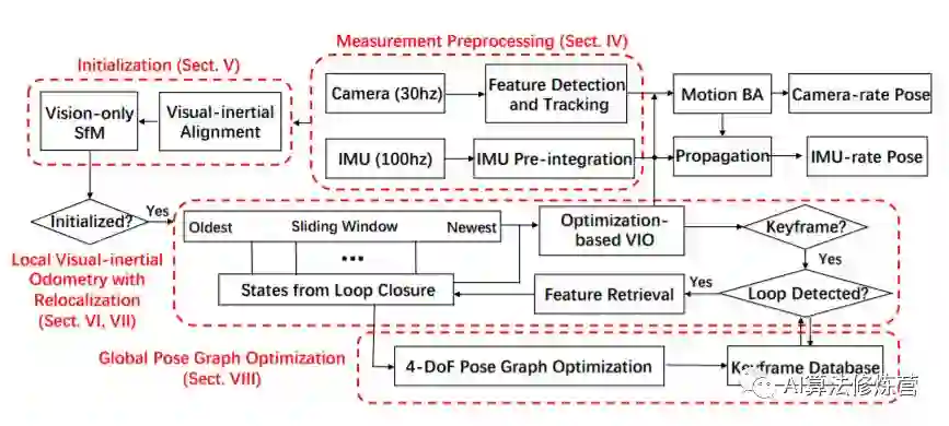 从上图可以看出,系统主要包括五个部分:数据预处理、初始化、后端非线性优化、闭环检测、位姿图优化。