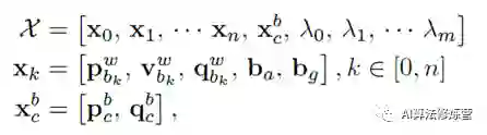 需要优化的量:IMU状态(PVQ、加速度bias、陀螺仪bias)、IMU到Camera的外参、m+1个路标点逆深度。