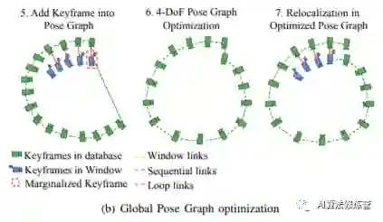 由于视觉-惯性 使得横滚角和俯仰角完全可以观测,因此只有(XYZ和yaw航向)4个自由度存在累积漂移。接下来只进行4-DOF的位姿图优化。