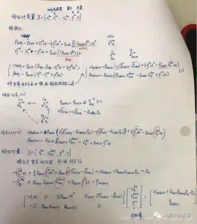 目标函数:相邻两帧IMU预积分增量与预测值之间平移、速度(P、V)的差。通过HX=B 利用cholesky分解获得。具体推导过程如下: