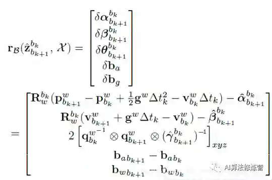 第二个式子xk是在第k帧图像捕获到的IMU状态,包括位置,速度,旋转(PVQ)和加速度偏置,陀螺仪偏置。
