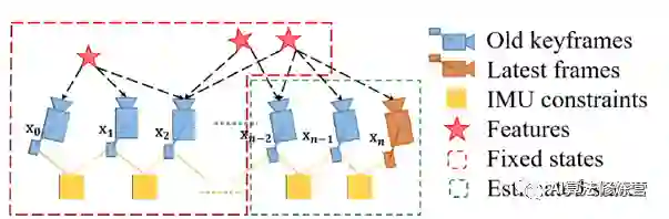 1、只对固定数量的最新IMU状态的姿态pose和速度v进行了优化,而不是对滑动窗口中的所有状态进行优化