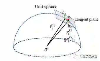在相机的归一化平面上比较残差,再将视觉残差投影到单位球面的正切平面上。由于视觉残差的自由度是2,所以我们将残差向量投影到切平面上。