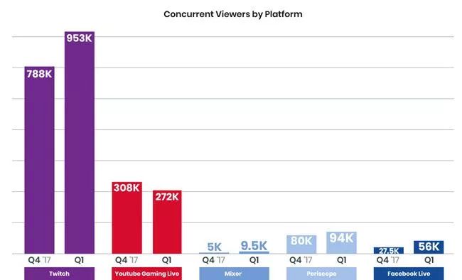 Twitch和同类竞品YouTube Live Gaming以及其它平台的同时观看人数对比