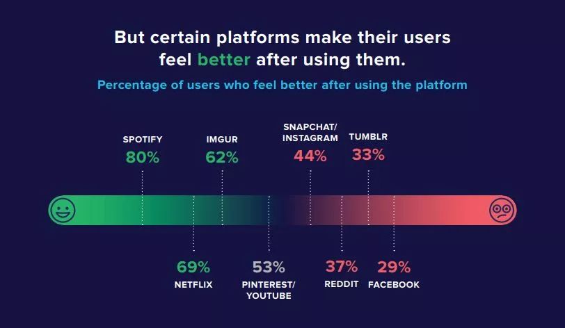 Imgur的匿名性促成了它的成功,在Instagram、Facebook等社区,用户会尝试塑造完美形象,而匿名社区Imgur和Reddit中才会出现真实的自己。据调查,多数用户希望查看自己关注而非算法推荐的内容,也希望使用的社区更加真实,以内容为驱动,62%Imgur用户会在使用过后感觉更开心,该比例仅次于Spotify和Netflix,而Snapchat、Facebook等社交软件则让人越用越不爽。
