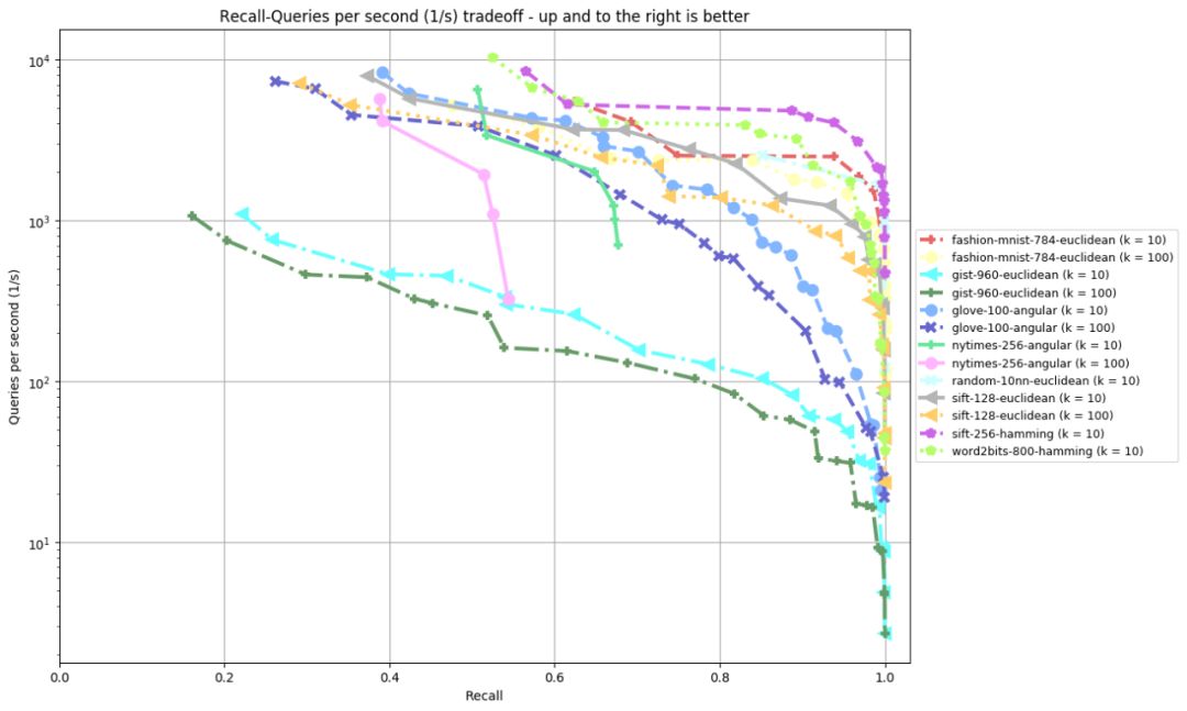 针对向量召回的工具,存在大量的开源实现,在技术选型的过程中,我们参照ANN-Benchmarks以及Erikbern/ANN-Benchmarks中的性能评测结果。在众多ANN相关的工具包内,考虑到性能、内存、召回精度等因素,同时可以支持GPU,在向量召回方案的测试中,选择以Faiss作为Benchmark。