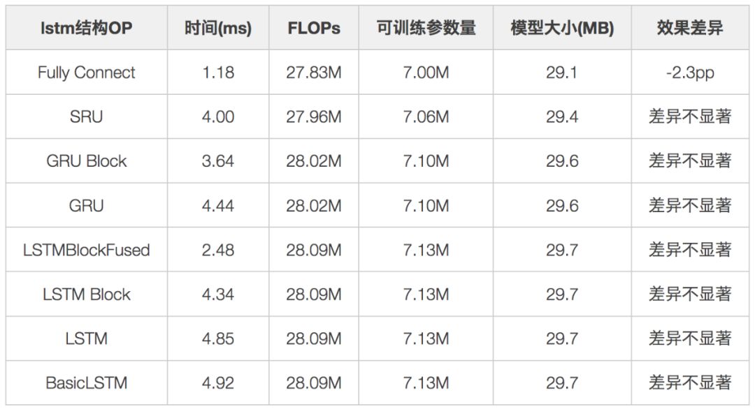 考虑到序列处理的需求,评估使用了LSTM/GRU/SRU等模块,同时在TensorFlow中,LSTM也存在多种实现形式,包括BasicLSTMCell、LSTMCell、LSTMBlockCell、LSTMBlockFusedCell和CuDNNLSTM等实现,由于整个交付模型运行在CPU上,故排除CuDNNLSTM,同时设置了全连接层FullyConnect加入评估。
