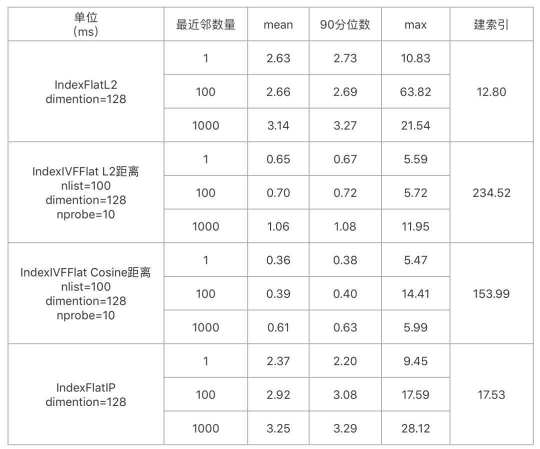在整个技术迭代的过程中,由于整个解决方案对于性能有着较为苛刻的要求,需要单独对方案性能进行分析。本章节对向量召回方案及深度学习方案进行了相应的性能分析,以便在线下确认性能指标,最终保证上线后性能均达到要求。下文分别着重介绍了向量匹配的工具Faiss以及TensorFlow Operation算子的选取,还有对于整体性能的影响。