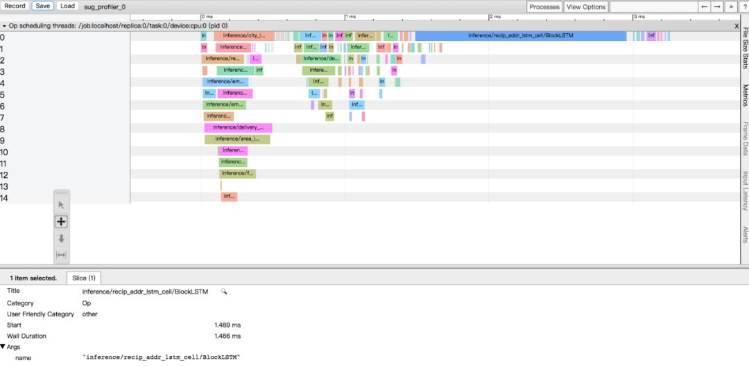 为了评测深度学习交付模型的性能瓶颈,首先对整个模型进行Profile,下图即为Profile后的Timeline,其中整个计算大部分消耗在序列模块处理部分,即下图中的蓝色部分。故需要对序列模块的计算性能进行OP算子的加速。