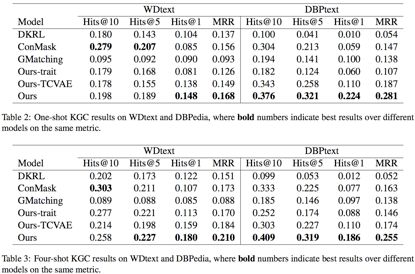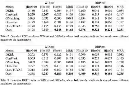 本文在few-shot问题上引入了文本信息作为补充信息,并提出了entity trait的概念,也就是实体的embedding应该是relation-specific。同时为了解决在meta-testing的训练阶段训练不足的问题,还提出了一个基于VAE的Triplet Generator来人工生成三元组补充训练数据。