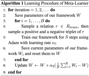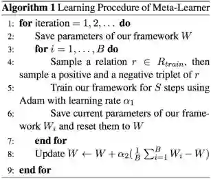 将每种关系的KGC看作是一个task,把所有task分为训练集Rtrain,验证集Rval,以及测试集Rtest。在meta-training的阶段每次都随机抽取B个task训练模型,得到模型参数W。在meta-testing的阶段对每个task都随机抽r个三元组继续训练模型,得到模型参数W’,再在剩下的三元组上测试模型性能。