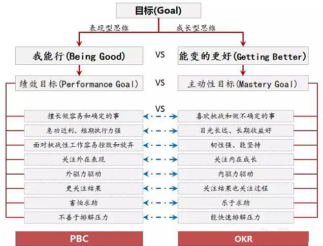 2. OKR更强调员工自主发挥能动性,把目标定得更具挑战性,同时不作为员工绩效考核的直接输入,它定出的目标实际上就是主动性目标(Mastery Goal),即Getting Better型目标。