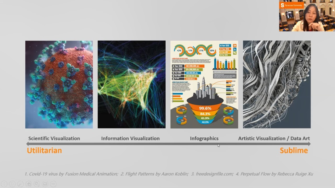 徐瑞鸽教授在题为《From Utilitarian to Sublime - the Exploration in Representing Data》的报告中从可视化艺术家的视角讨论了数据可视化的不同表现形式。在讲座开始,她首先从应用(Utilitarian)和升华(Sublime)这一对立统一的维度讨论数据可视化领域中不同工作的侧重点(图 1)。包括科学可视化在内,以应用为目标的设计更加强调视觉传达的实用性;以升华(Sublime)为导向的可视化工作则更侧重视觉传达的美感和人文知识的体现,力图挖掘人与自然的深刻内涵,最终升华则形成了艺术可视化/数据艺术;而信息可视化以及信息图表则在致用性和致美性两端之间,在准确传递信息的同时还可以吸引用户注意力。